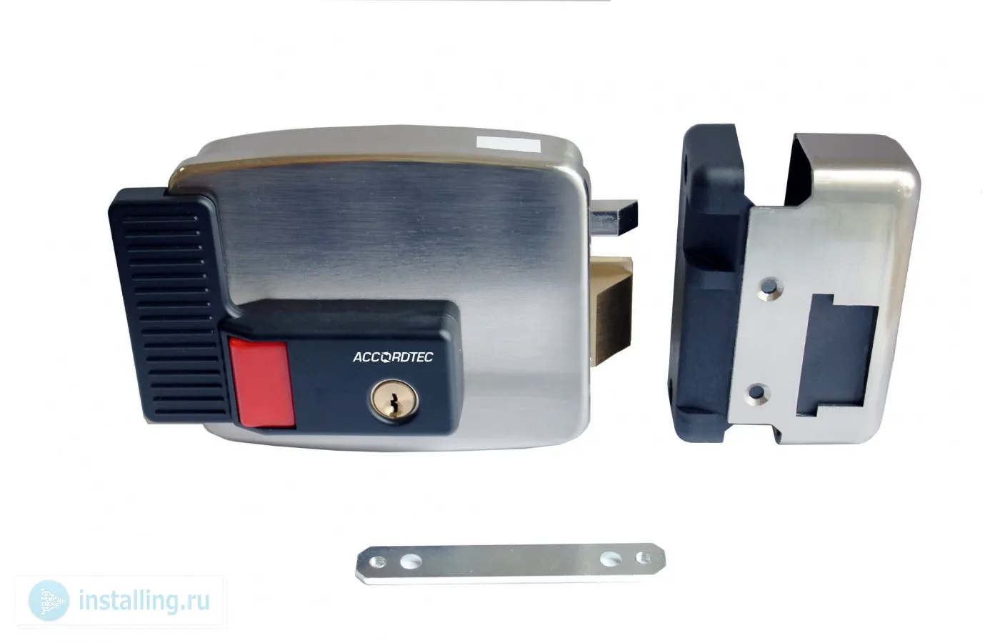 AT-EL101GF.4 (внешний левый); НЗ; 12В DC; 3,5 А (импульс до 1 сек.); Открывается при подаче питания (нормально-закрытый замок), время управления не более, сек 1; Функция: выход по кнопке, блокировка кнопки открытия (выход по сигналу от СКУД, фиксация замка в открытом положении (свободный проход), вход по ключу из комплекта. Материал корпуса никелированная сталь; -30 +50°C, 148х107х35 мм; 1,3 кг. Способ установки: дверь открывается на внешнюю левую сторону.