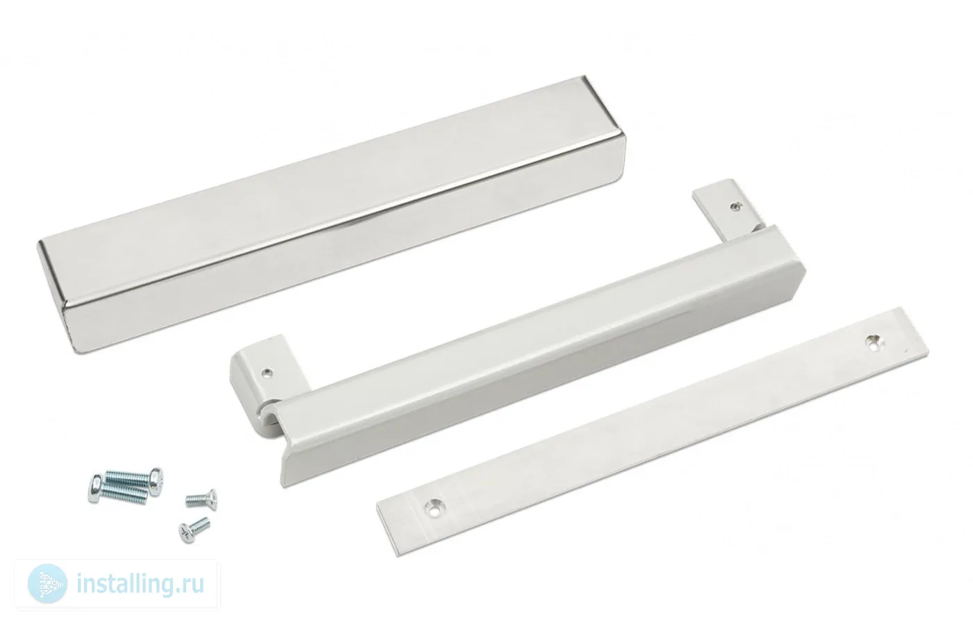 Монтажный комплект для крепления якорной части замка ALM-400S на полотно стеклянной двери. Цвет кожуха: полированная нержавеющая сталь; цвет кронштейна: серый. Для монтажа обеих частей замка (якорной и корпусной) необходимо два монтажных комплекта MK 400S-GL.