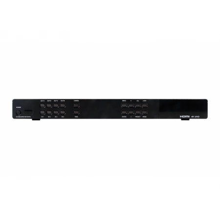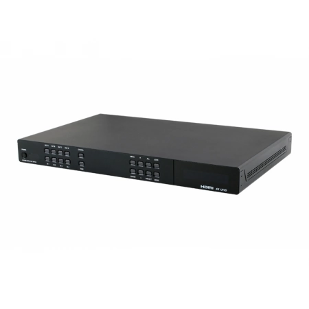 4х4 HDMI 4K2K (4096?2160p/30, YUV420 - 4096?2160p/60, 3D) с HDCP 1.4 и EDID, контроллер системы управления, обучаемый ИК(mJack), триггерные входы (8хТерм.), RS-232(2хDsub-9), 10/100BaseT(4хRJ-45), релейные выходы (8хТерм.), выходы ИК