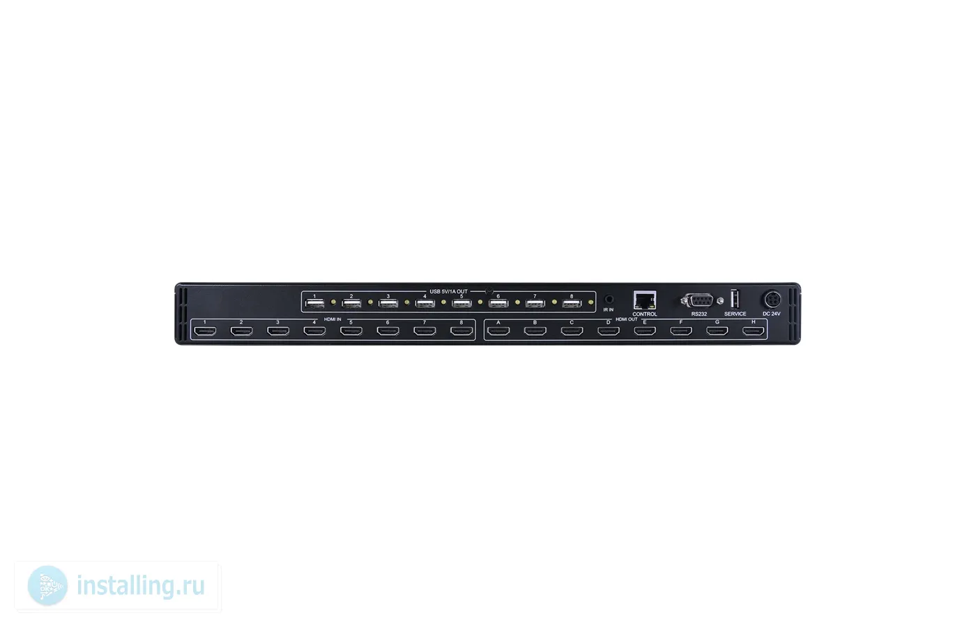 8х8 HDMI 2.0 4096x2160/60, 3D (4:4:4) с HDCP 1.4, 2.2 и расширенным EDID, 8 выходов USB для питания AOC, полоса пропускания 600 МГц, 8 пресетов, управление по ИК, RS-232 и IP (Telnet и web-интерфейс).
