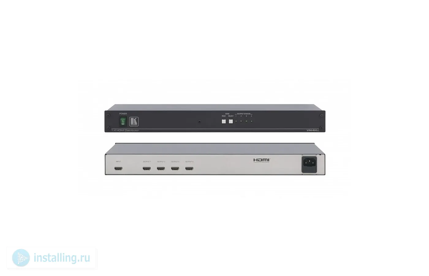 VM-4Hxl - усилитель-распределитель сигналов HDMI с разрешением до 1080p и WUXGA включительно. Он выполняет перетактирование сигнала и компенсацию АЧХ кабеля, после чего выдает сигнал на четыре одинаковых выхода. ВНИМАНИЕ! Для гарантии получения правильных результатов (разрешений, видеорежимов) при работе с конкретными дисплеями ОБЯЗАТЕЛЬНО проведите процедуру считывания EDID (см. раздел "Acquiring EDID" в руководстве по эксплуатации прибора).