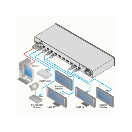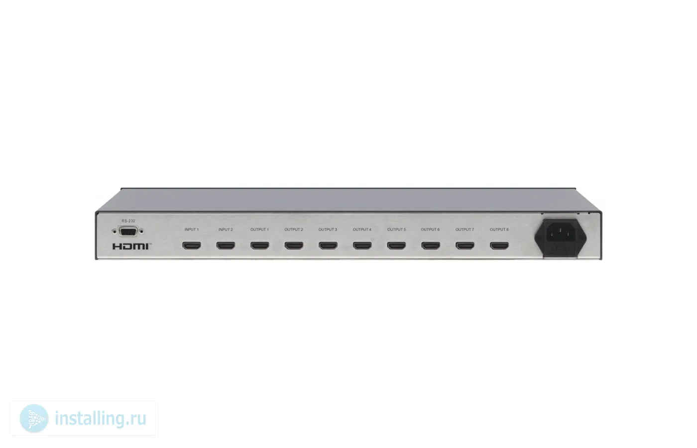 VM-28H - усилитель-распределитель сигналов интерфейса HDMI. Прибор выполняет компенсацию потерь в кабеле и перетактирование сигналов, поступающих на 2 входа, и выдают сигнал с одного из них по выбору на восемь одинаковых выходов.
