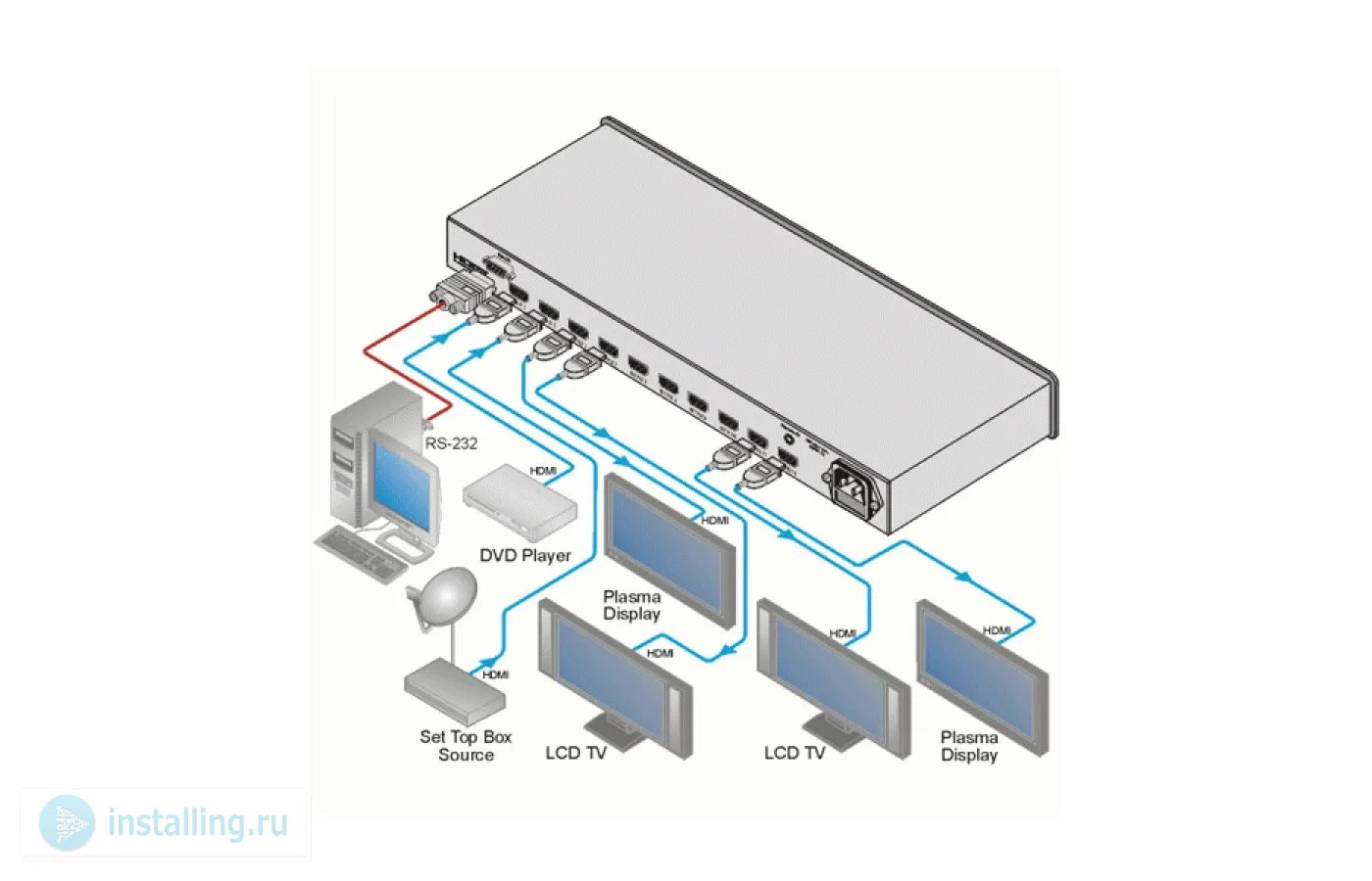 - коммутация входов кнопками на передней панели, с ИК пульта или командами по интерфейсу RS-232