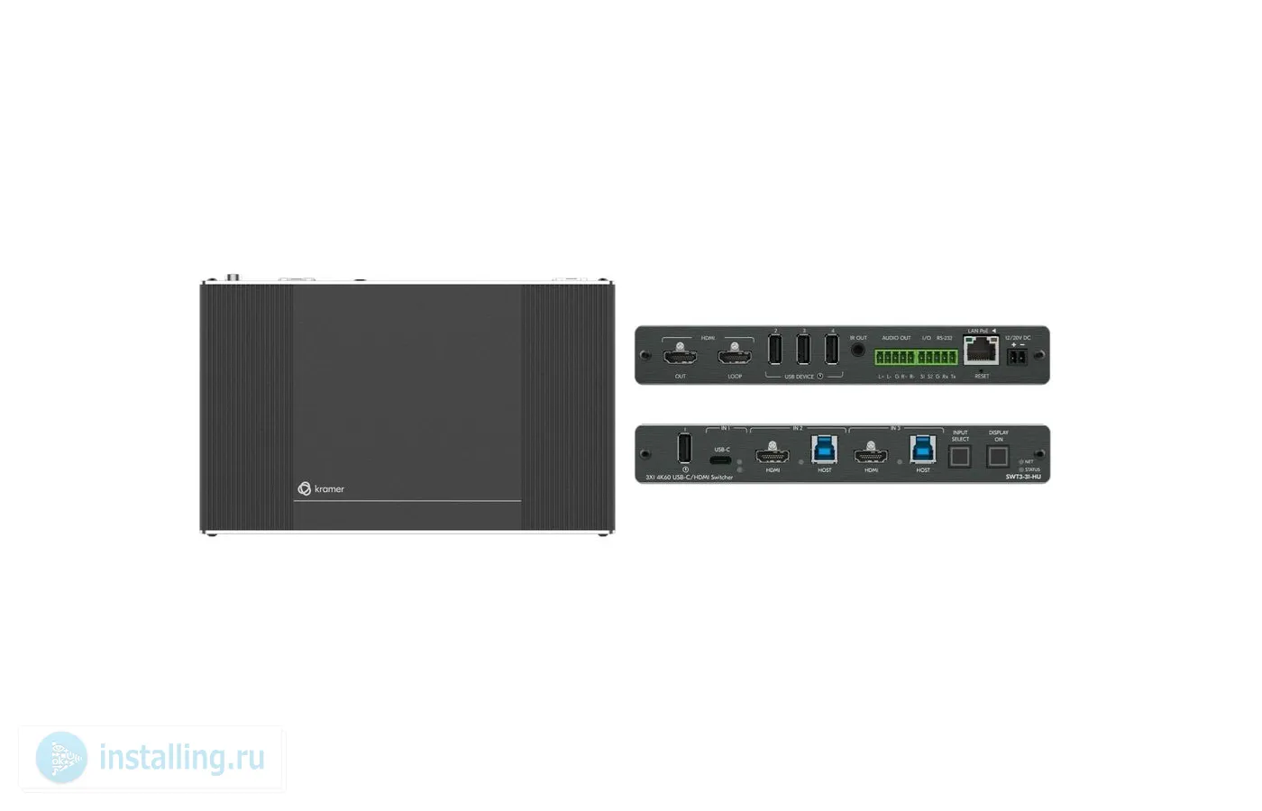 SWT3-31-HU — автоматический коммутатор 3х1 с входом USB-C, двумя комбинированными входами HDMI/USB-B и выходом HDMI. Также имеется четыре входа USB-A для подключения периферийных устройств в помещении (клавиатура, мышь, камера, саундбар), которые можно переключать на один из двух активных хостов USB-B одновременно с переключением источников аудио-видеосигнала на общий дисплей с входом HDMI.