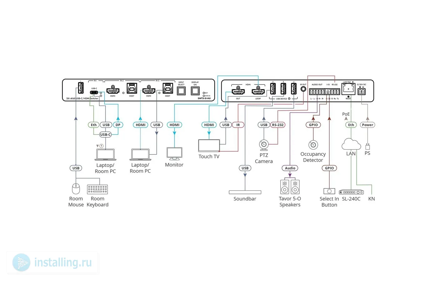 - Параллельная коммутация источников аудио-видео сигнала с устройством отображения и периферийных USB-устройств с активным USB-хостом для удобства гибридной совместной работы