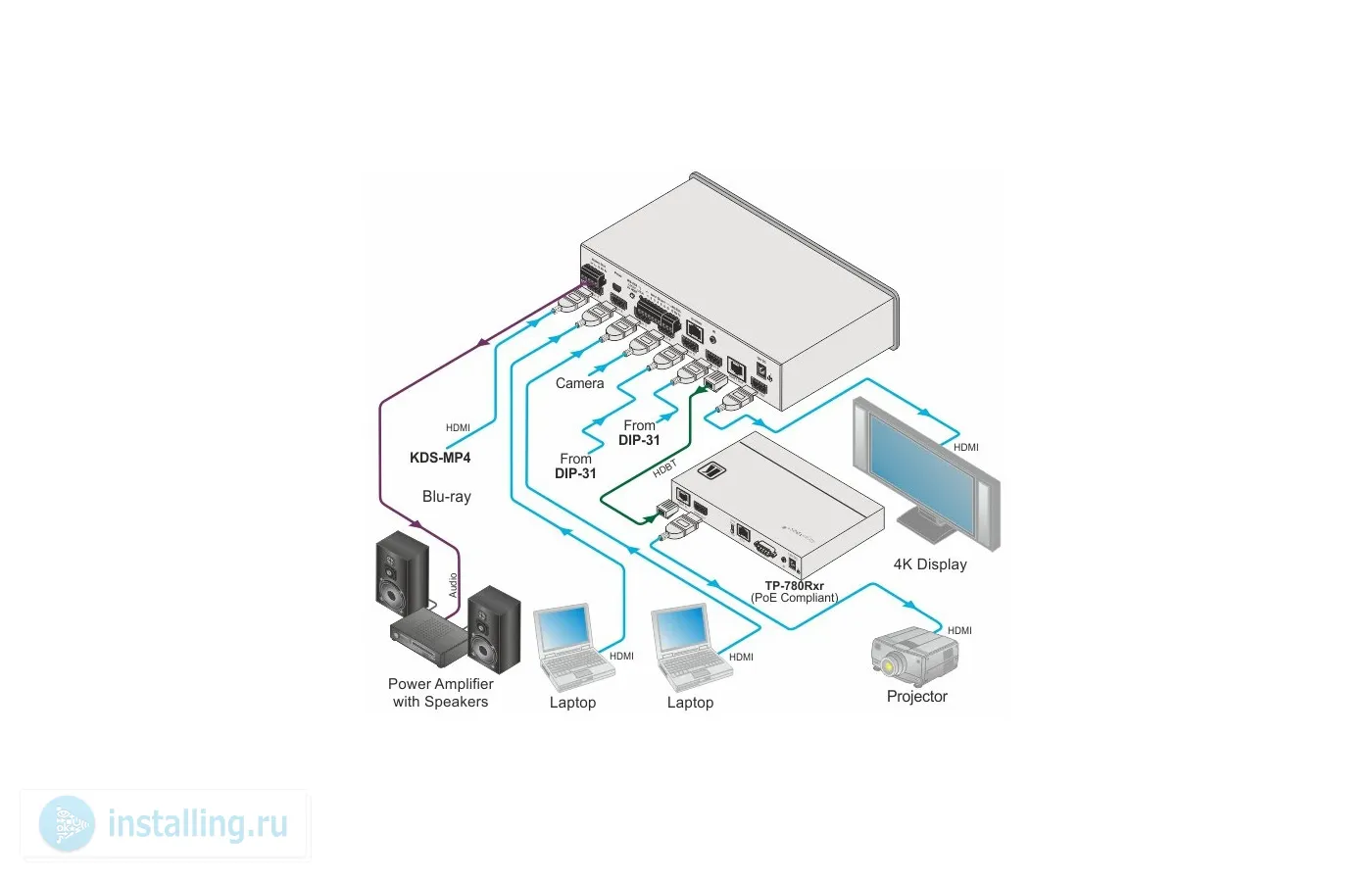 - Сертифицирован альянсом HDBaseT, функциональность включает передачу двунаправленного RS-232, Ethernet, ИК, PoE
