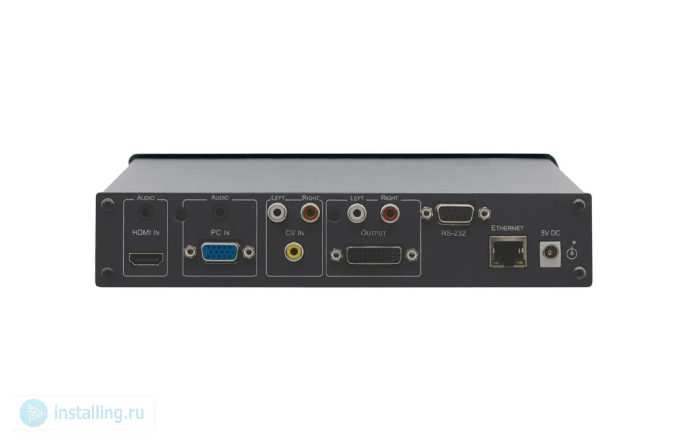 Масштабатор и коммутатор сигналов HDMI, VGA/YPbPr, композитного видео и аудио в HDMI с дополнительным выходом аудиостерео. Каждому входу видео соответствует вход небалансного стереоаудио. Поддерживаются входные/выходные разрешения до 1080p60 и WUXGA
