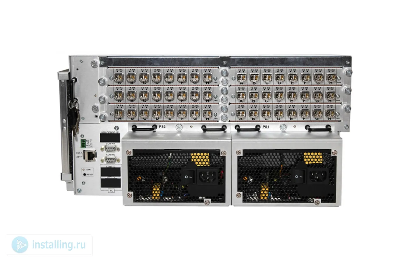 С 6-ю слотами для установки сменных плат входов, выходов VG-Matrix. Каждая из таких плат может быть оборудована восемью входными и/или выходными оптическими модулями SFP с разъемами LC. Коммутация осуществляется по многом