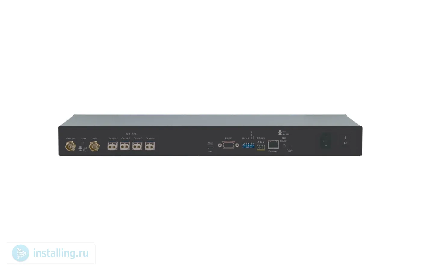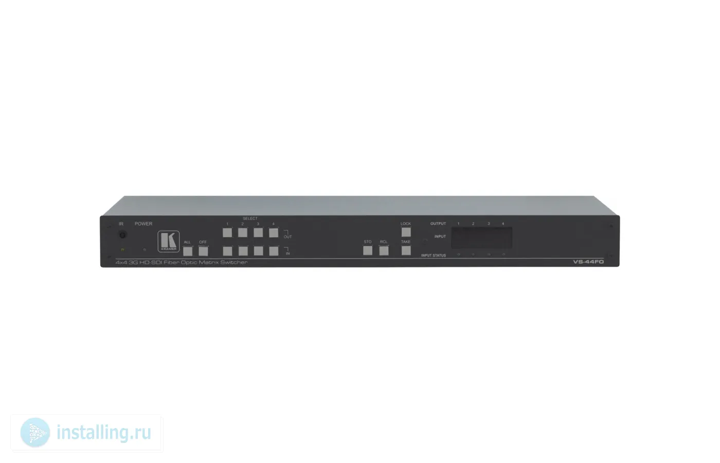 4x4 сигналов 3G HD-SDI, передаваемых по оптоволоконным кабелям. Прибор коммутирует входы на выходы в любой комбинации, а также может выдавать сигнал с любого входа на все выходы.