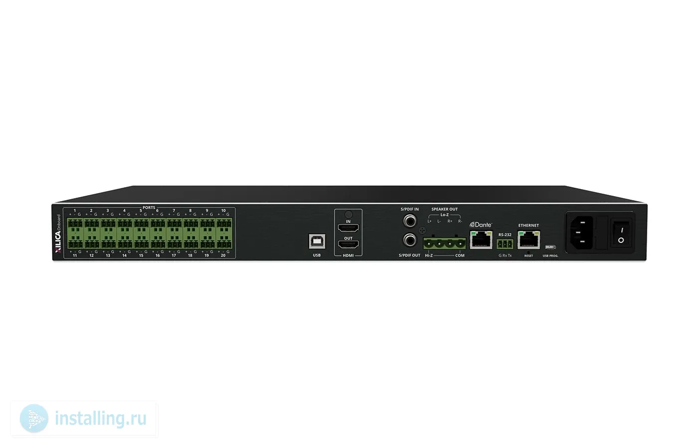 AFM-20DSP-AEC – матричный аудиопроцессор с DSP и AEC, позволяет настраивать конфигурацию входов/выходов из ряда 4x16, 6x14, 8x12, 10x10, 12x8, 14x6, 16x4. Входные каналы имеют включаемое фантомное питание 48 В, также есть Dante 4х4 и порт USB работающий в режиме 2х2. Устройство обеспечивает эмбеддирование или деэмбеддирование звука с проходного сигнала HDMI. Наличие встроенного усилителя 2х60 Вт / 8 Ом и 1х120 Вт / 70/100 В обеспечивает дополнительное удобство использования. Устройство настраивается и управляется по IP или RS-232. Корпус для монтажа в стойку, высота 1U.