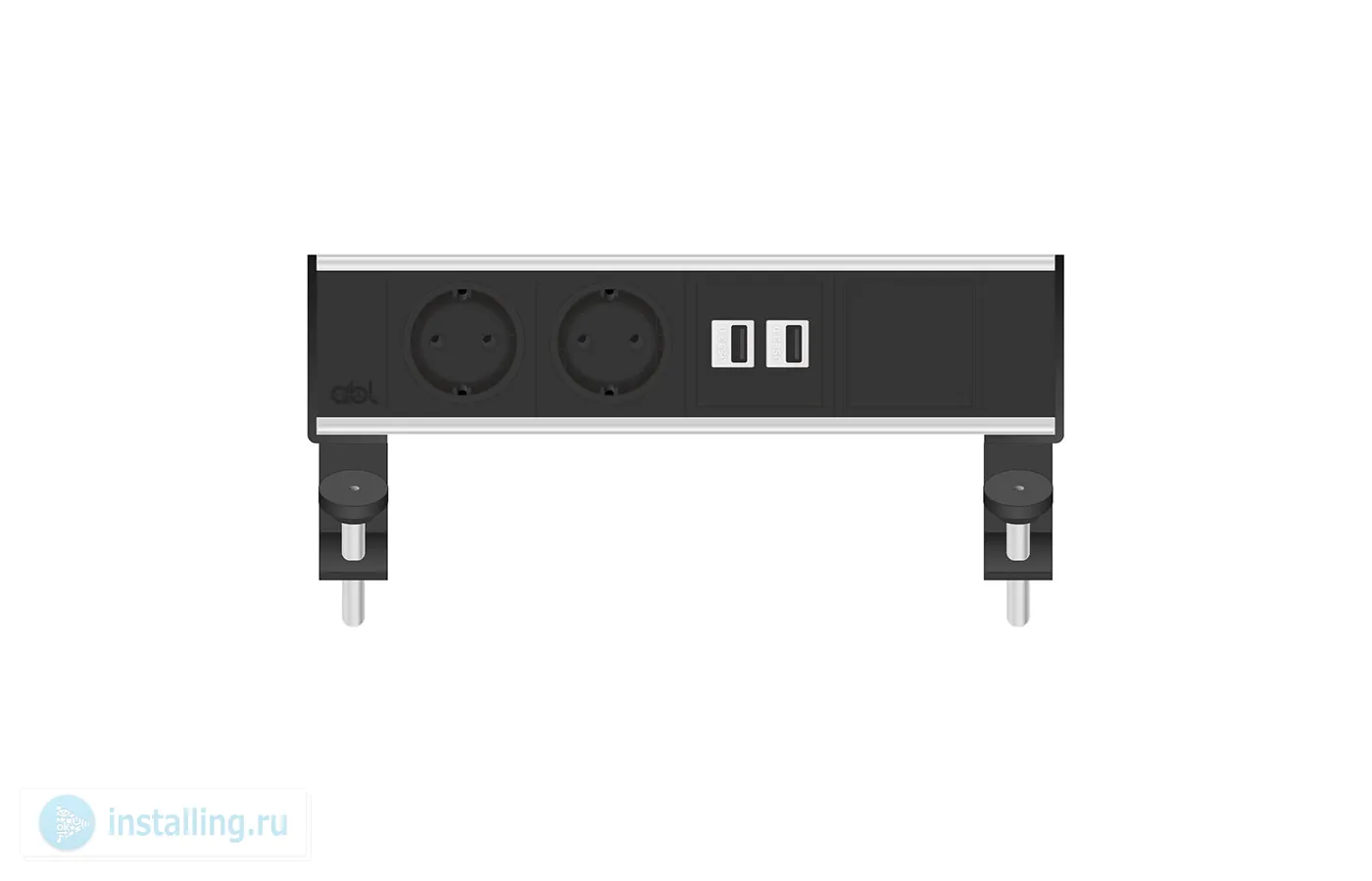 2 розетки (Schuko); 2xUSB, тип А (2,4 А); 1 слот для установки модуля подключения IMP (приобретается отдельно). Разъем для кабеля питания GST18i3 (розетка). Монтаж к столу: 2 зажима типа C. Толщина столешницы: 15, черная с серебристым