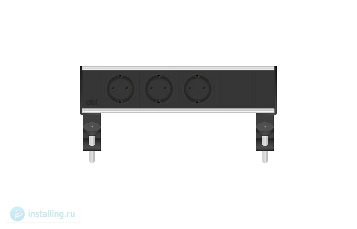 3 розетки (Schuko); 1 слот для установки модуля подключения IMP (приобретается отдельно). Разъем для кабеля питания GST18i3 (розетка). Монтаж к столу: 2 зажима типа C. Толщина столешницы: 15–40 мм., черная с серебристым