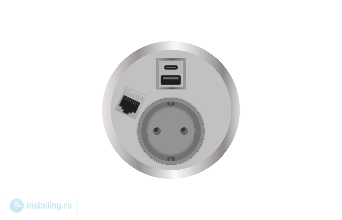 1xUSB, тип C и 1xRJ45 для витой пары Cat6A. Толщина столешницы: 15–45 мм. Диаметр монтажного отверстия: 80 мм. Габаритные размеры (?xВ): 96x77 мм. Разъем для кабеля питания GST18i3 (розетка). Цвет белый.