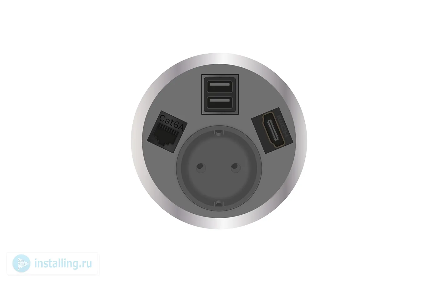 Тип А (2,4 А); 1xHDMI и 1xRJ45 для витой пары Cat6A. Толщина столешницы: 15–45 мм. Диаметр монтажного отверстия: 80 мм. Габаритные размеры (?xВ): 96x77 мм. Разъем для кабеля питания GST18i3 (розетка). Цвет серый.