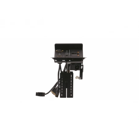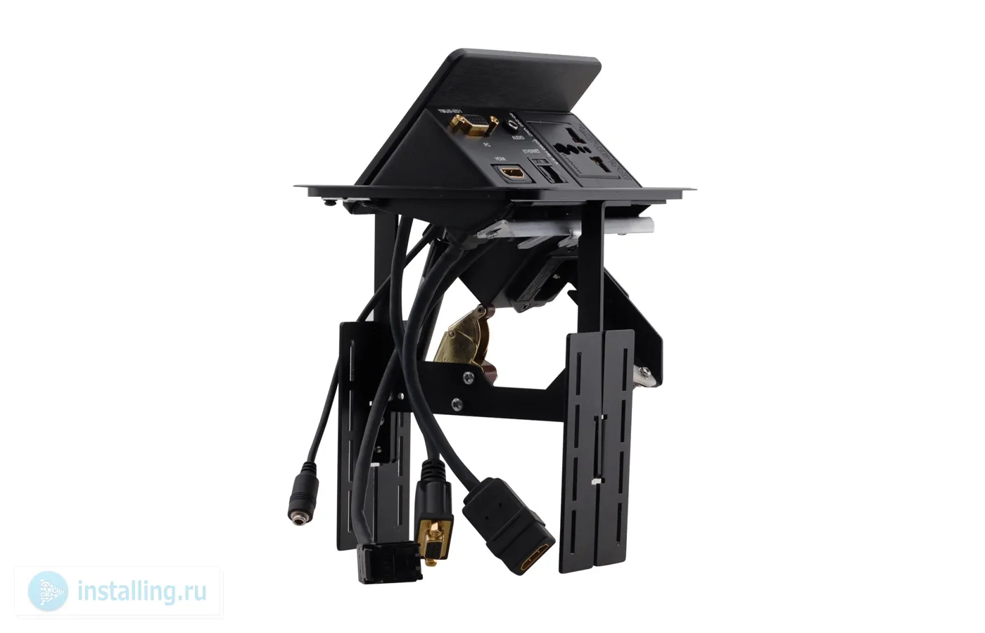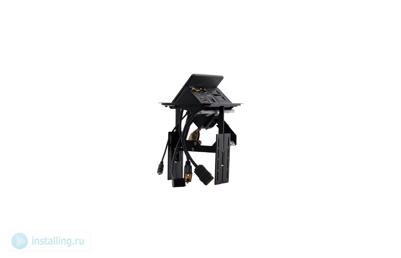 - пневматический демпфер панели разъемов, которая открывается и закрывается легким нажатием на нее. Когда коробка не используется, панель опускается, ее крышка располагается вровень со столом, а разъемы убираются под стол