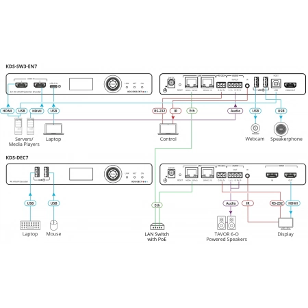 KDS-SW3-EN7 – кодер и передатчик в сеть Ethernet сигналов HDMI с разрешением до 4K/60 Гц (4:2:0), аудио, RS-232, ИК и USB. Можно выбирать один из входов: 2хHDMI или USB-C. Оснащен проходным выходом HDMI. Производит преобразование сигналов HDMI, эмбеддированного аудио, RS-232, ИК и USB в цифровой поток, передаваемый по сети IP на основе витой пары в режиме Unicast или Multicast. Устройство также способно производить кодирование аудиосигнала в IP-поток Dante. Управление по IP, KDS-7-MNGR. Совместимый приемник: KDS-DEC7.