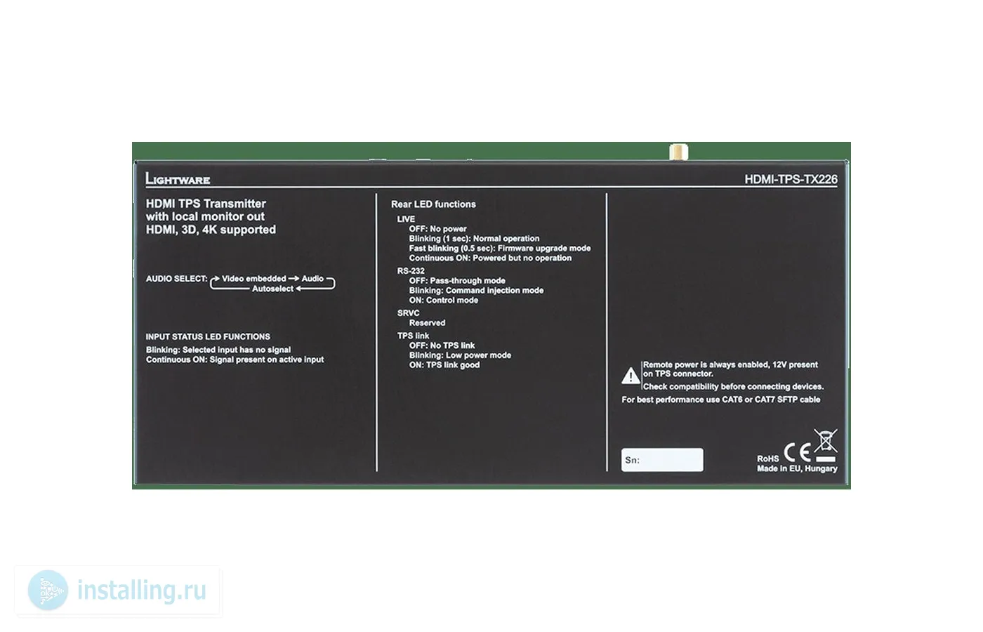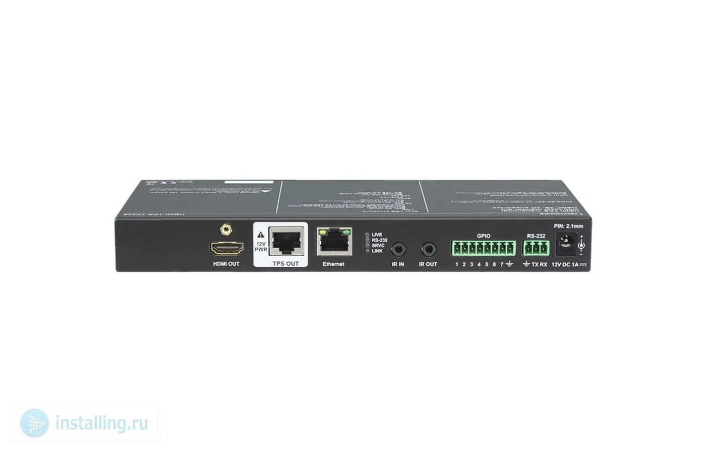 Кроме того, RS232 и ИК-соединение поддерживают подачу команд. Дистанционное питание доступно через единственный кабель CAT5e или лучше, но можно использовать и локальный источник питания. Все устройства могут быть установлены на полке в стойке или использоваться в автономном формате. HDMI-TPS-TX226 совместим как с удлинителями HDBaseT, так и с матричными коммутаторами.