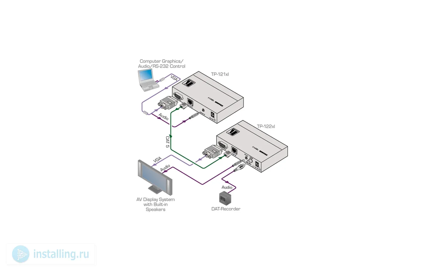 TP-121xl - передатчик сигнала VGA разрешением до 1080p и стерео аудио по кабелю "витая пара" на расстояние до 250 метров. Поддержка EDID - прибор может сохранять в энергонезависимой памяти и воспроизводить из нее параметры дисплея. При использовании в комплекте c приемником серии TP-122XL, удаленном на расстояние до 60 метров, можно использовать один источник питания - второй прибор получит его по кабелю "витая пара"