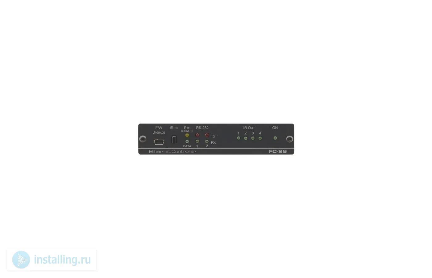 FC-26 – двунаправленный преобразователь RS-232 (RS-485) и ИК для передачи по Ethernet. Высокопроизводительный прибор, позволяющий управлять по локальной Ethernet-сети двумя устройствами с RS-232 и четырьмя устройствами, "понимающими" команды инфракрасного интерфейса. Преобразователь прост в настройке и использовании – для настройки и управления используется веб-интерфейс, поддерживаемый большинством современных браузеров.При совместной работе с программным обеспечением K-Touch прибор принимает команды инфракрасного или последовательного интерфейса из Ethernet-сети от удаленных устройств, преобразует их обратно в сигналы ИК/RS-232 и выводит на запрашиваемый порт ИК/RS-232, данные ответа направляются всем подключенным по Ethernet панелям управления. Преобразователь выполнен в компактном корпусе Kramer TOOLS™, питание прибора осуществляется по кабелю витой пары (PoE) или от дополнительного внешнего блока питания.