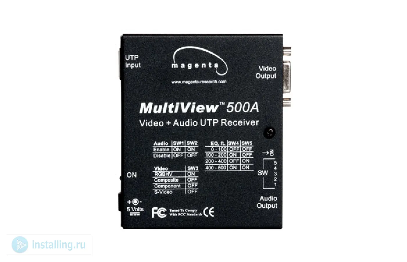 MV500-A серии MultiView для сигналов VGA / RGBHV / RGB / компонентного / композитного / S-video и аналогового небалансного псевдостереофонического аудиосигнала, передаваемых по кабелю неэкранированной витой пары 5-й категории длиной до 150 м.