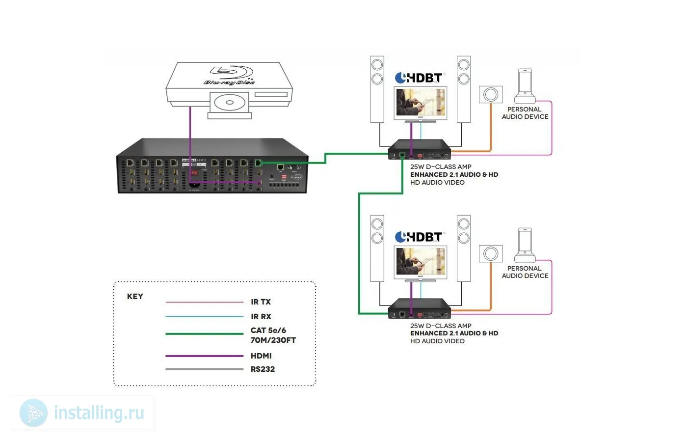 - Длина кабеля витой пары cat6 между передатчиком HDBaseT и AMP-001-010 до 70 метров. До следующего приемника HDBaseT так же до 70 метров.