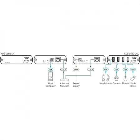 KDS-USB2-DEC – приемник (декодер) сигнала USB 2.0 из сети Ethernet. До семи таких устройств могут использоваться с одним передатчиком.
