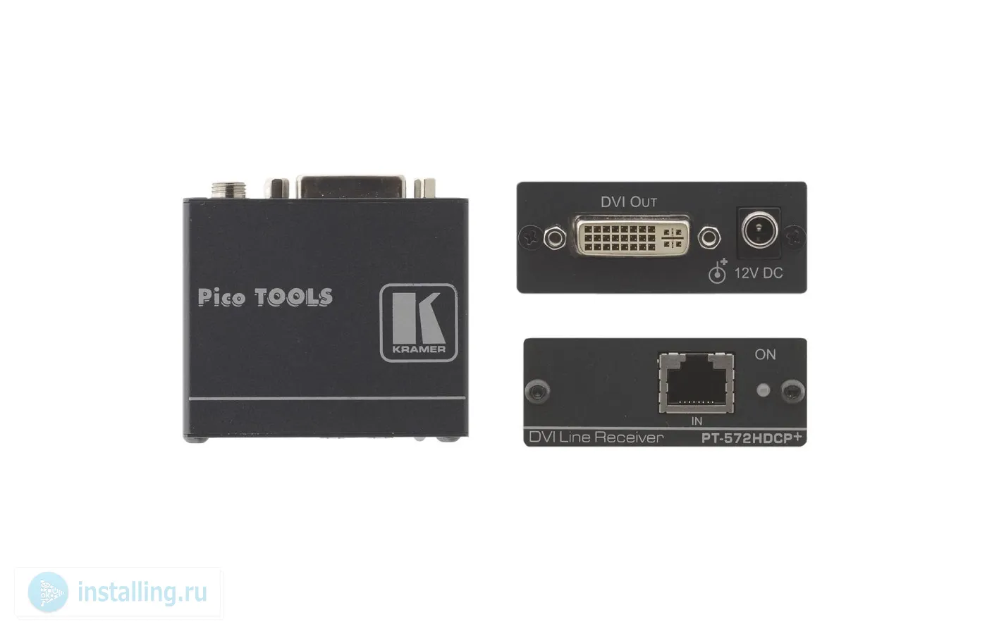 Выполняет обратное преобразование сигнала, получаемого от передатчика PT-571HDCP, в формат DVI. Максимальная скорость передачи данных — 1,65 Гбит/с на канал. Входы: 1 – витая пара DGKat, разъем RJ45 (розетка) Выходы: 1 – DVI-D Single Link, разъем DVI 25-pin (розетка) Пропускная способность:4,95 Гбит/с (1,65 Гбит/с на канал) Макс. разрешение:1080p Удлинение по витой паре: 12 В, 250 мА p/n: 90-70985090