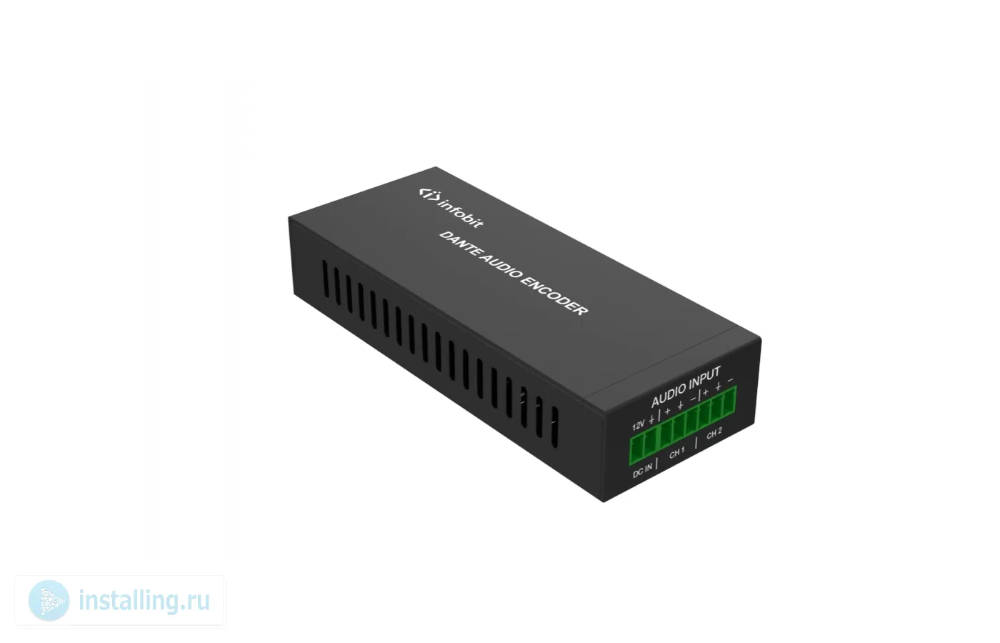 Аналог - Dante (передатчик), 2 аналоговых входа (6-pin phoenix, балансный/линейный), 1xRJ45(Dante). Питание PoE или DC (12В). 120мм[Ш] x 47мм[Г] x 26мм[В]