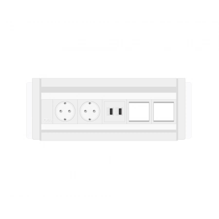 2 розетки (Schuko); 2xUSB, тип А (2,4 А) и 2 слота для установки модулей подключения IMP (приобретаются отдельно). Монтаж к столу: врезной. Толщина столешницы: 10–30 мм.