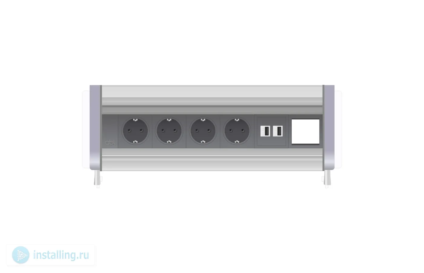 4 розетки (Schuko); 2xUSB, тип А (2,4 А) и 1 слот для установки модуля подключения IMP (приобретается отдельно). Монтаж к столу: врезной. Толщина столешницы: 10–30 мм.