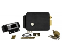 Замок электромеханический накладной НЗ, универсальный, цилиндр снаружи, цилиндр и кнопка изнутри, блокировка ключом в закрытом состоянии, сталь, цвет черный, 12 В, 3,5 А, 163 х 47 х 103 мм
